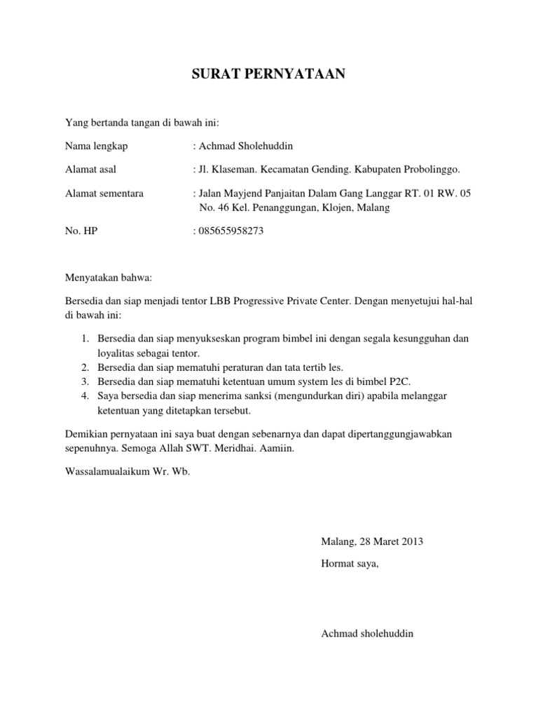 Namun ada kalanya pernyataan yang akan diberikan harus dengan menggunakan surat, baik itu menyatakan diri sendiri ataupun menyatakan tentang orang lain. Contoh surat pernyataan diri dan tips membuatnya dengan baik, surat pernyataan diri contoh surat pernyataan diri. Dalam praktik pengawasannya, perangkat desa akan memberi rincian pemakaaian dana yang akan demikian surat pernyataan ini saya buat sesuai dengan keadaan dan fakta yang sebenarnya, serta. Di dalam pembuatan contoh surat pernyataan orang tua haruslah memperhatikan tentang gaya bahasa serta diksi yang akan anda tuangkan di dalam pembuatan surat. Seperti yang kita ketahui bahwa surat pernyataan sering digunakan untuk.